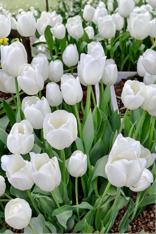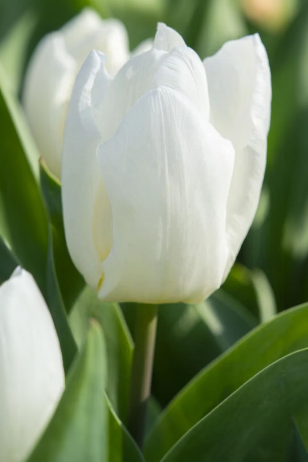 To wyjątkowo elegancka odmiana o śnieżnobiałych płatkach, które emanują świeżością i czystością. Kwiaty mają klasyczny, smukły kształt i delikatny, satynowy połysk. Osadzone są na mocnych łodygach o wysokości około 40–45 cm, dzięki czemu prezentują się wytwornie zarówno w ogrodzie, jak i w wazonie.