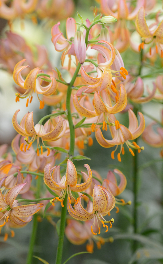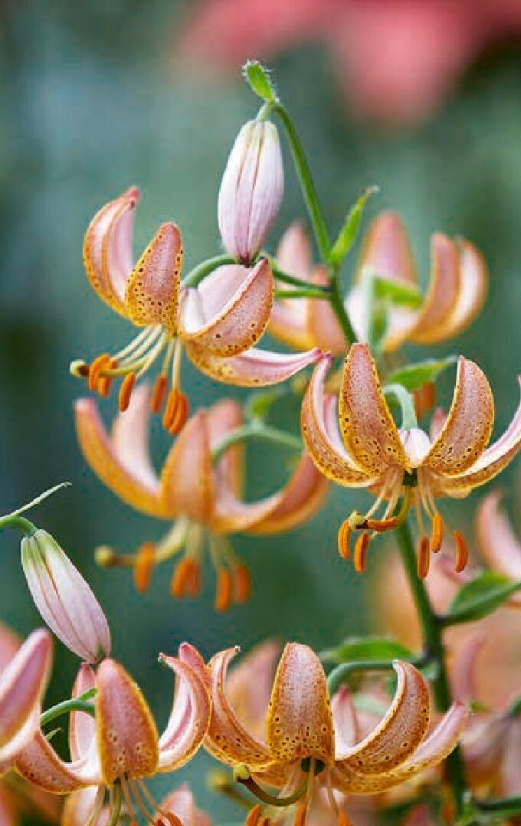 Lilia Martagon Fairy Morning: mieszaniec z grupy Martagon. To krzyżówka lilii Złotogłów z L. Hansonii. Jego kwiaty są małe, o różowo-żółtym kolorze, z nakrapianym środkiem. Tak, jak w przypadku innych Martagonów, potrzebuje rok aby „zadomowić się’. Gdy jest dobrze osadzony, potrafi osiągnąć powyżej 1,5m i wytworzyć wiele kwiatów.Lilie martagon są piękne, ale kapryśne, szczególnie na początku uprawy. Nie będą rosły wszędzie. Jeśli chcemy cieszyć się ich urokiem, musimy koniecznie starannie przygotować właściwe stanowisko. Kiedy jednak nasze martagony już się zadomowią w ogrodzie, to będą rozkwitać przez wiele sezonów – są długowieczne i odporne.