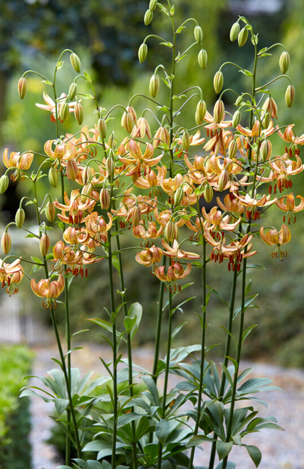 ‘Peppard Gold’ to martagon, który wygląda jak złoty kandelabr w ogrodzie. Kwiaty są turbanowe (płatki mocno odgięte do tyłu), zwisające jak mini lampiony, w odcieniu brzoskwiniowo-złotym / złocisto-żółtym, gęsto posypane cynamonowo-bordowymi piegami. Na jednej łodydze potrafi pojawić się mnóstwo kwiatów, więc roślina robi efekt dzikiej elegancji i „leśnej biżuterii” – bardzo dekoracyjnej, ale naturalnej.