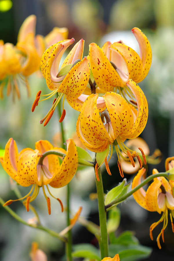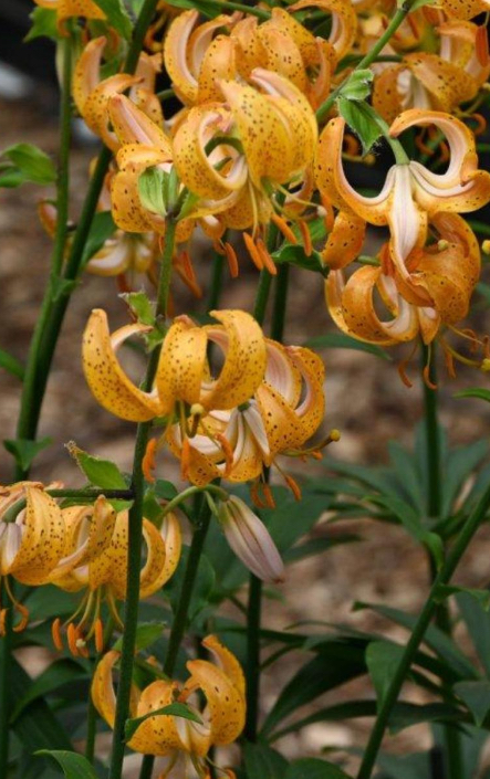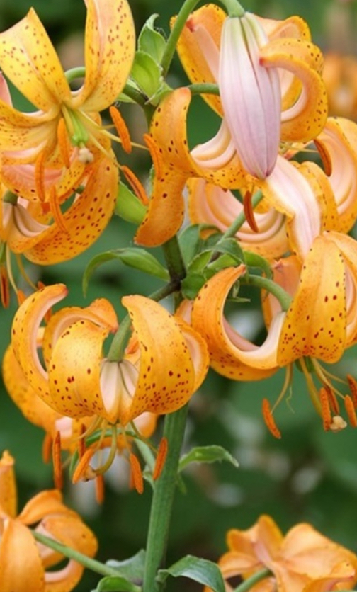 ‘Terrace City’ to martagon o wyjątkowej urodzie: kwiaty są złocisto-pomarańczowe, gęsto nakrapiane ciemnymi piegami, a płatki mocno się zawijają do tyłu (typowe „turbaniki”). Na jednej, smukłej łodydze kwiaty układają się warstwami, tworząc efekt dzikiej elegancji – jak leśna biżuteria, która przyciąga wzrok, ale nie jest krzykliwa.