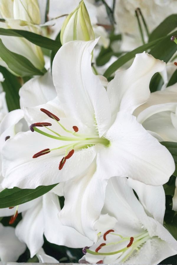 ‘Santander’ to lilia o klasie białej porcelany: wielkie kwiaty są śnieżnobiałe, świetliste, często z lekko pofalowanymi płatkami, które wyglądają jak jedwabna falbanka. To odmiana z tych „salonowych” – robi w ogrodzie efekt elegancji bez wysiłku, a przy tym potrafi pachnieć tak, że wieczorem aż chce się podejść bliżej.