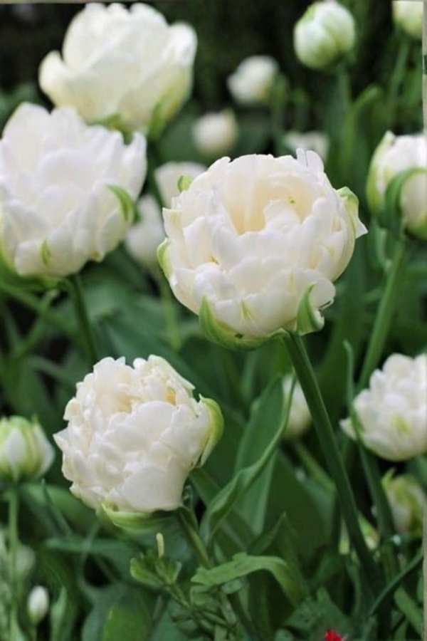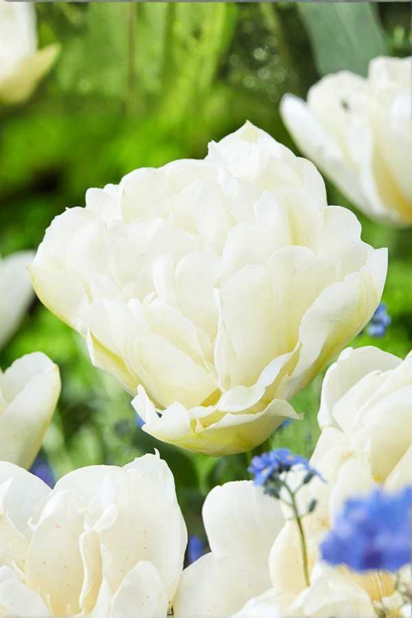 Określenie „pełny biały” oznacza po prostu tulipana o wielowarstwowych płatkach w białej tonacji — idealnego, jeśli chcesz w ogrodzie efekt czystości, światła i elegancji.