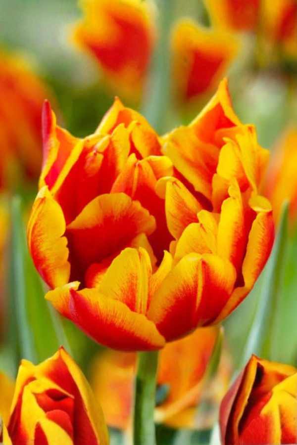 Jak wygląda i czym się wyróżnia?‘Crossfire’ to tulipan pełny (piwoniowy), który robi efekt „wow” od pierwszego spojrzenia: ognista czerwień spotyka się tu ze złoto-żółtym obrzeżeniem, jakby płatki były muśnięte płomieniem. Kwiat jest gęsty, wielowarstwowy, a gdy się rozwija, pokazuje kolejne „piętrą” płatków. Zwykle dorasta do ok. 30–40 cm.
